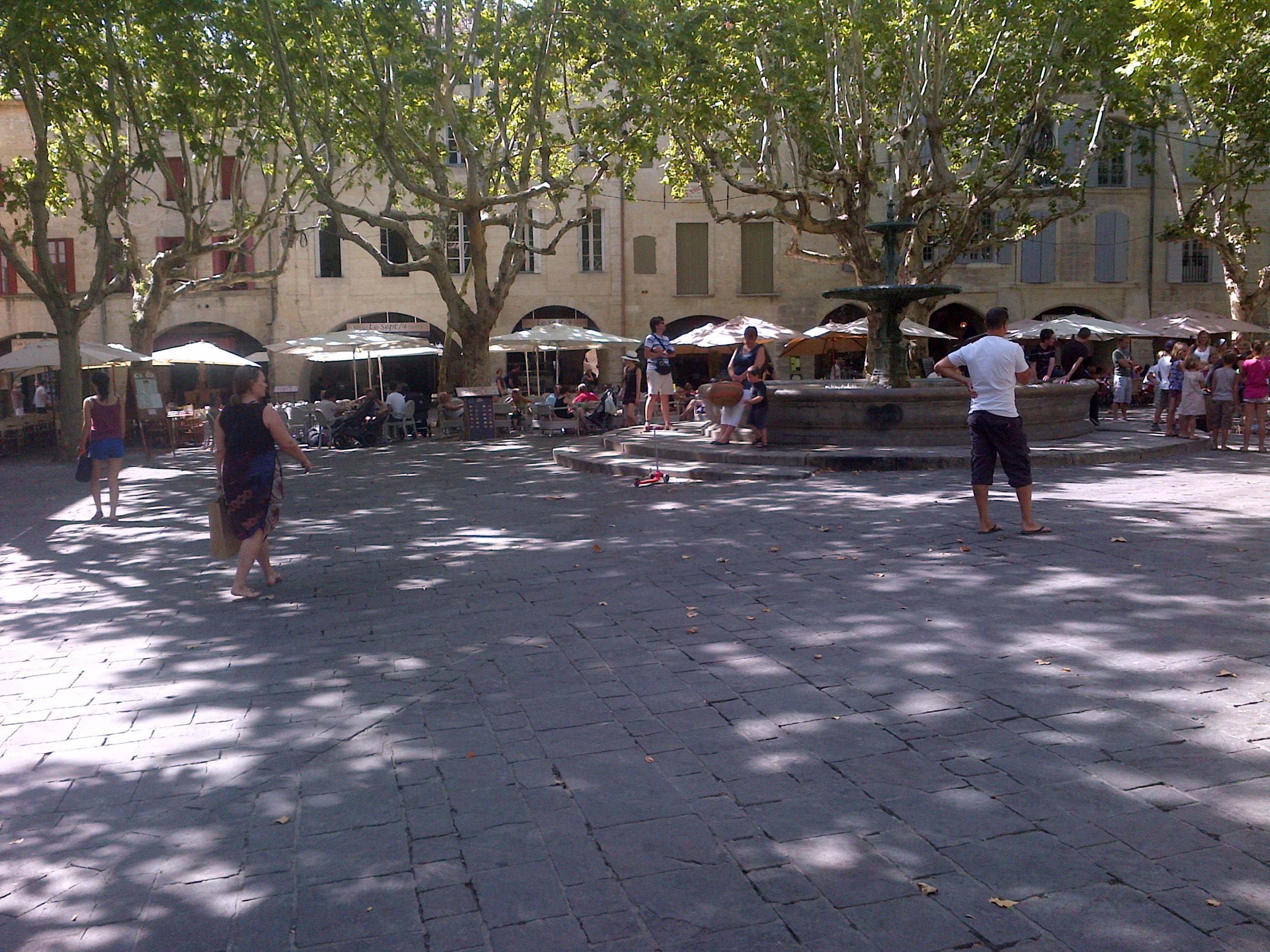 It was just after four in the afternoon when James strolled into the Place aux Herbes, in the small city of Uzes. The square lay languid under the upturned blue enamelled bowl of the sky. The seventeenth century former silk merchants’ houses were built of topaz coloured stone which glowed in the sun, their olive- green shutters closed to stop it from penetrating the interiors. The same strong light shone through the canopy of the plane trees created patterns across the paving stones, and under the vaulted arcades the shadows were the colour of a raven’s wing.